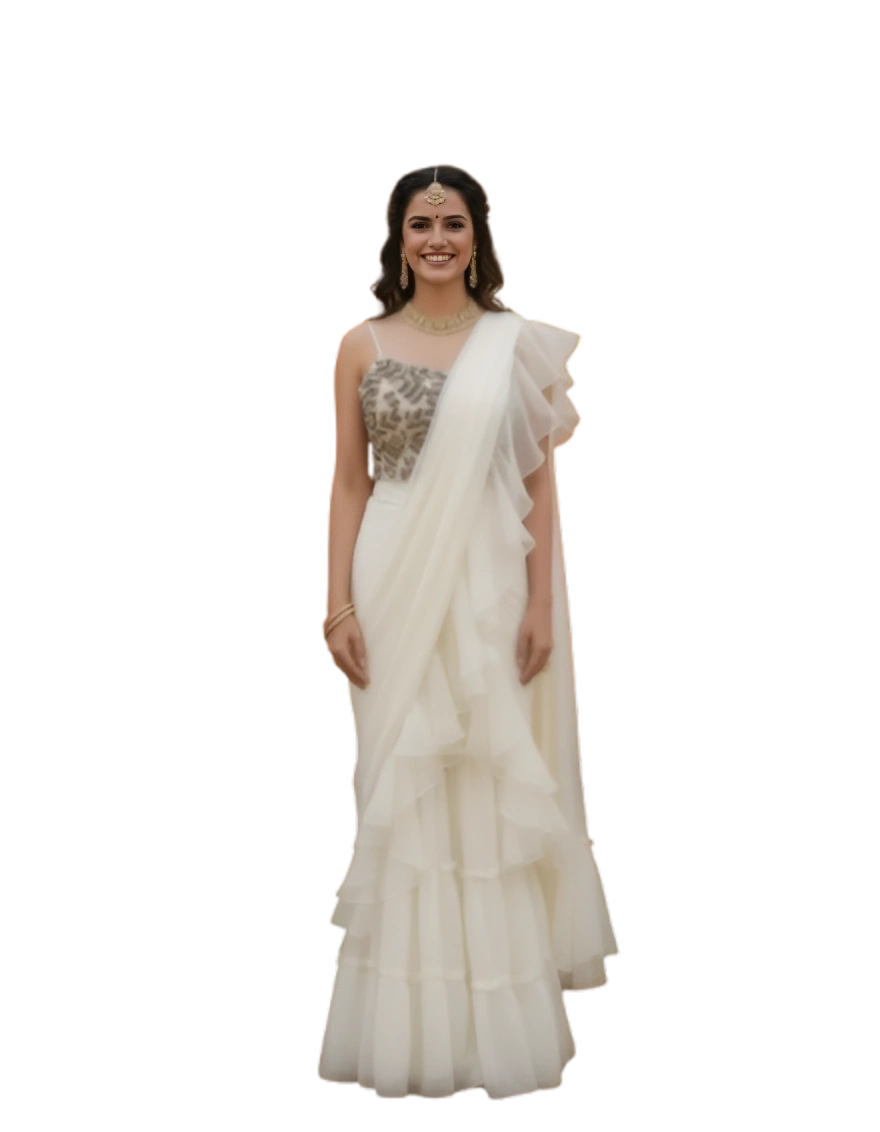 This elegant ruffled saree features layered frills, giving a modern twist on traditional Indian attire. It is ideal for festive occasions and weddings, combining style with cultural heritage.