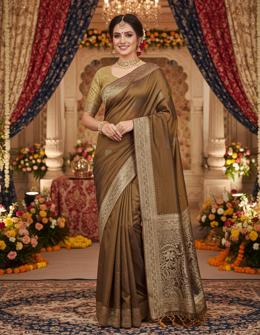 This elegant saree features a rich golden brocade work on a deep brown fabric, perfect for formal occasions and celebrations. The intricate design and luxurious feel make it a sought-after choice for traditional wear.