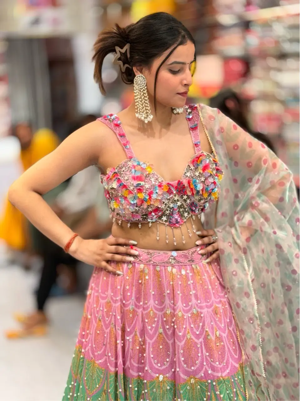 A stunning pink lehenga adorned with colorful floral embellishments and sparkling sequins. The vibrant color palette and intricate details make it perfect for festive occasions and celebrations.